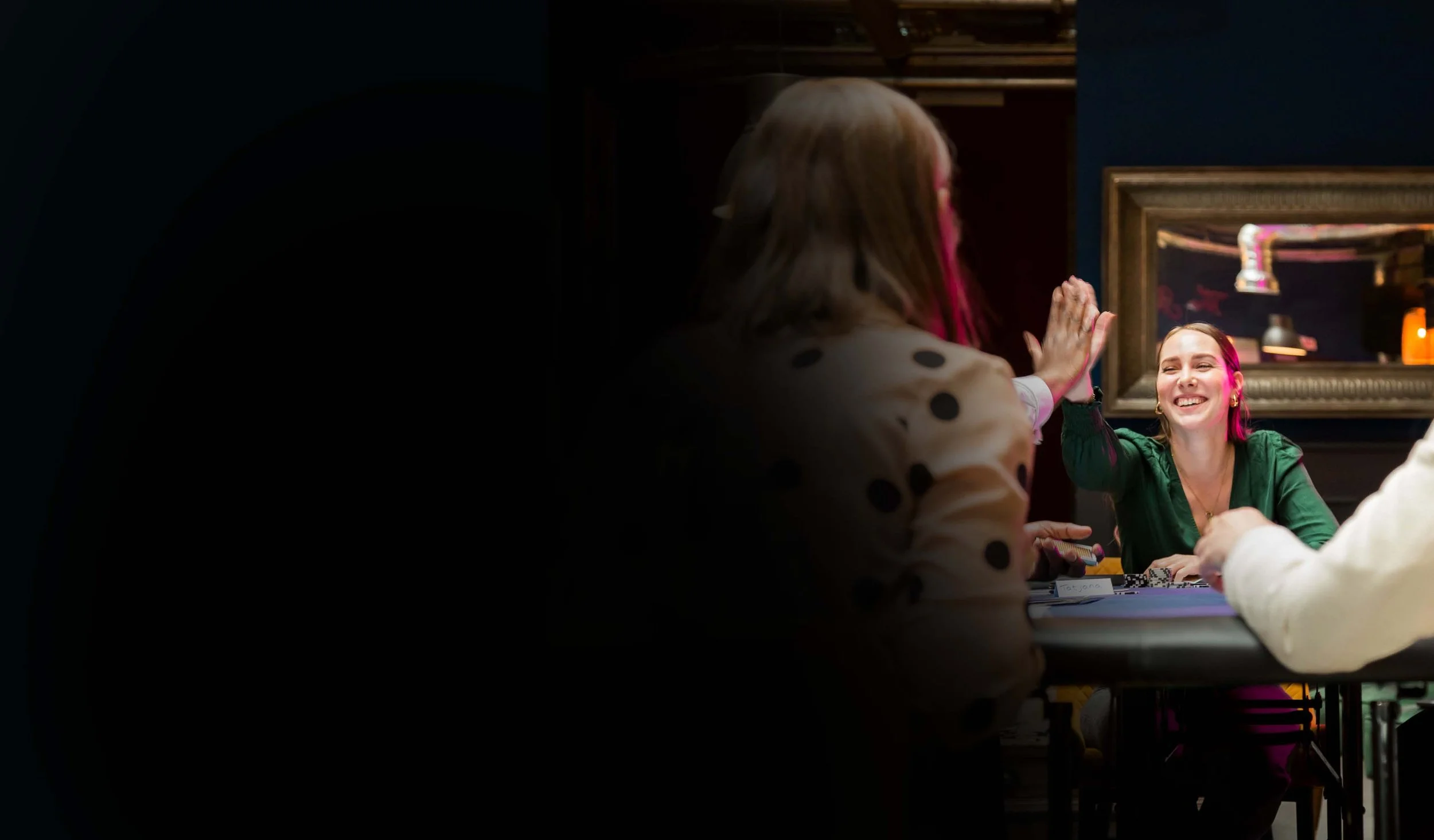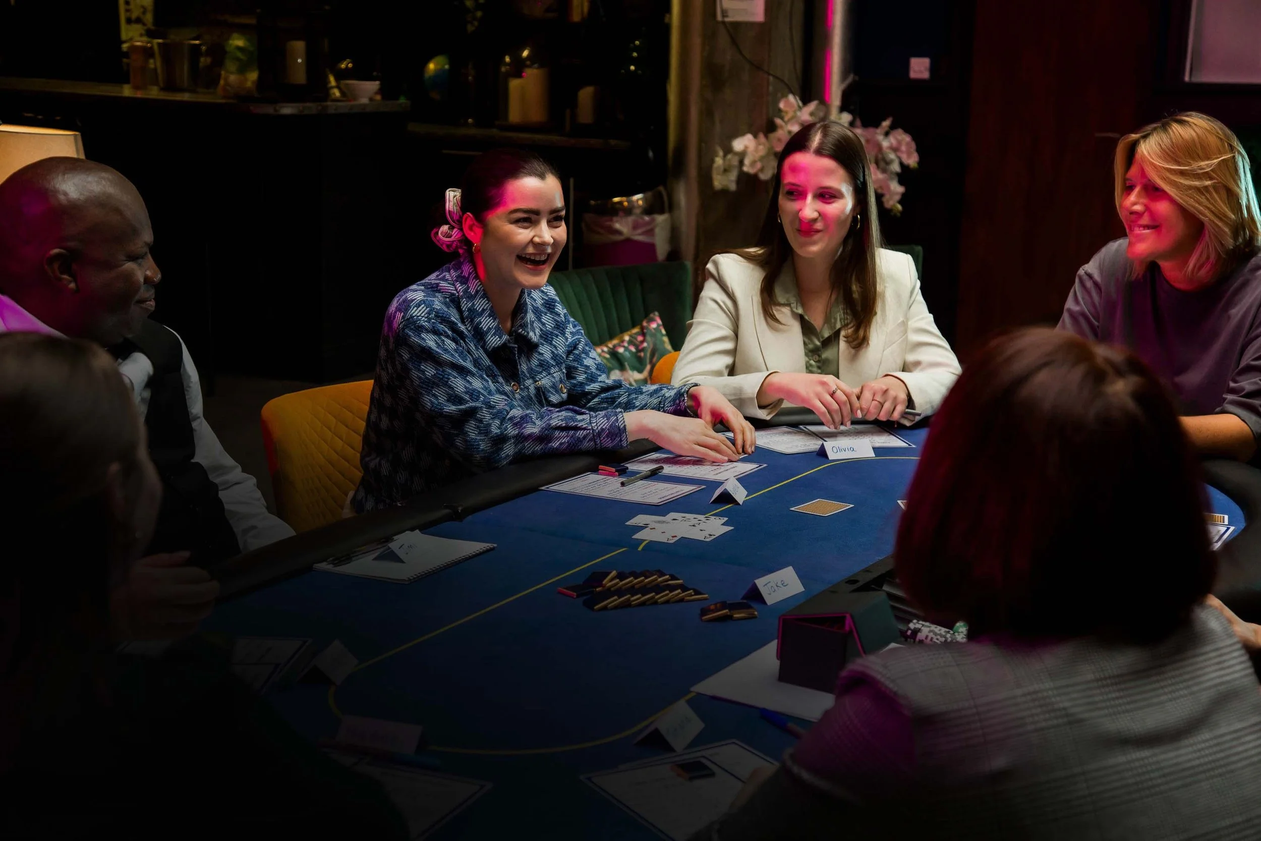 Founder of Aces High - Jo Living - at a Texas Hold'em poker table delivering corporate team-building workshop and skills training for team dynamics